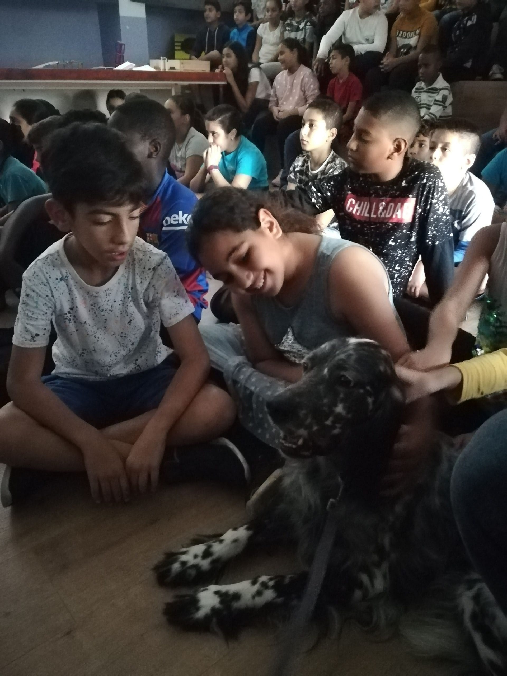 El nostre voluntari, els seus col•laboradors i els seus quatre gossos s’apropen als centres escolars que s’han ofert per acollir aquesta activitat i realitzen un taller de canicròs que consisteix en fer primer una xerrada informativa a l’aula i després els infants surten al pati per fer una petita corredissa amb els gossos i fer així un petit tast de canicròs.